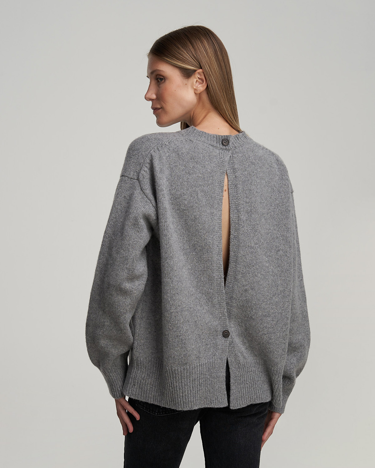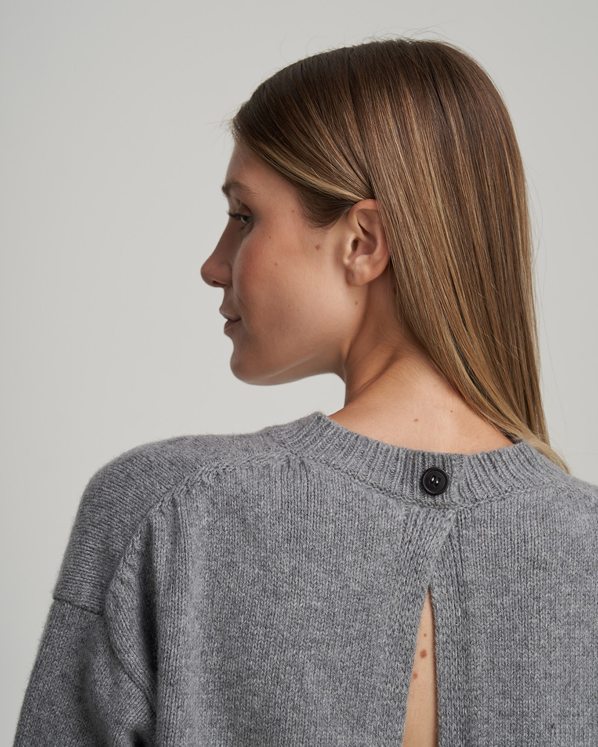 Round-neck sweater with back opening.