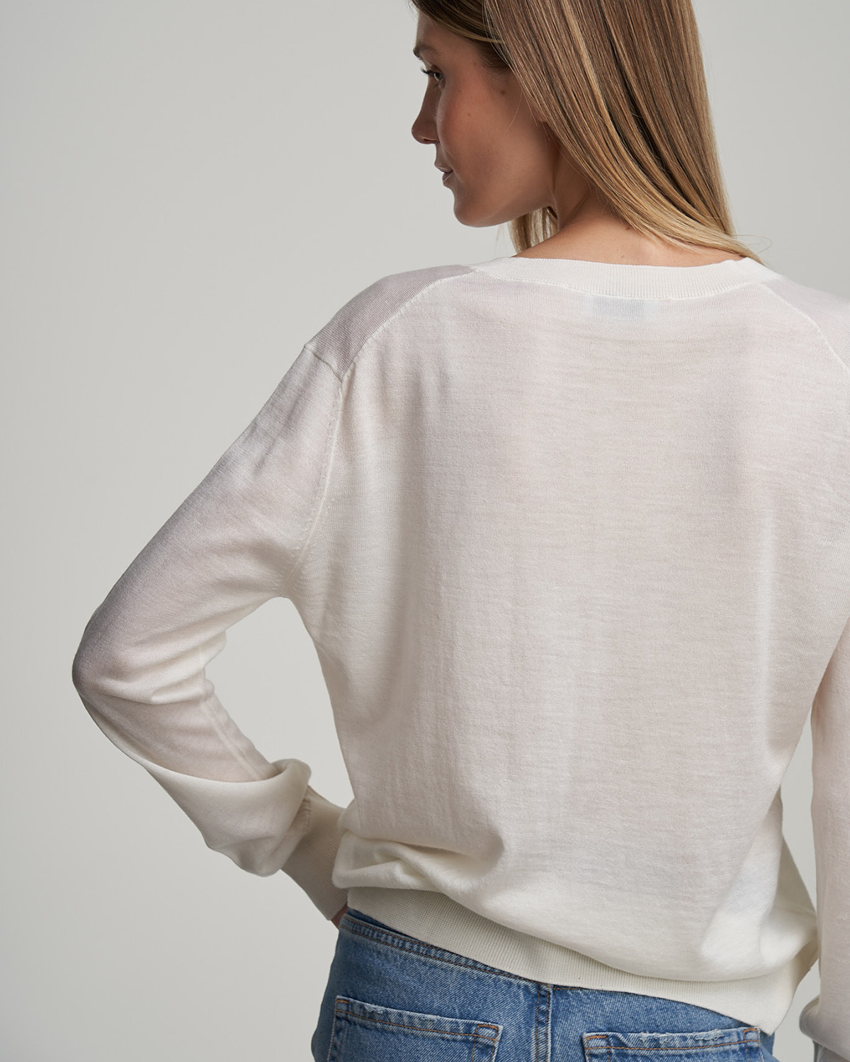 This garment is made from 75% merino wool and 25% silk. The wool used for this piece is referred to as “combed.” Combing is a process that occurs in the textile fiber manufacturing cycle, resulting in a smooth, homogeneous, thin, and even natural yarn, which allows for the creation of fine, delicate, and extremely lightweight knitwear.