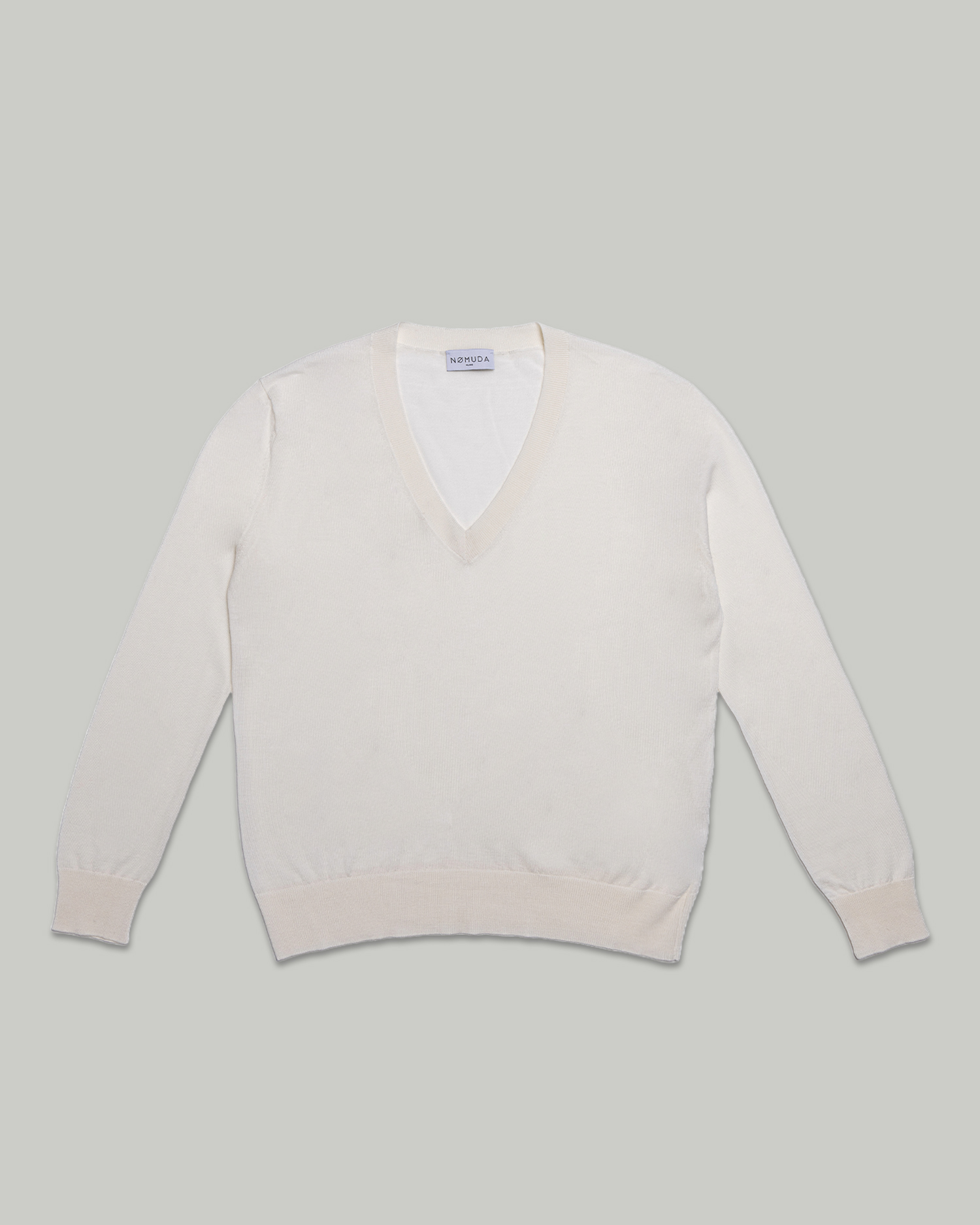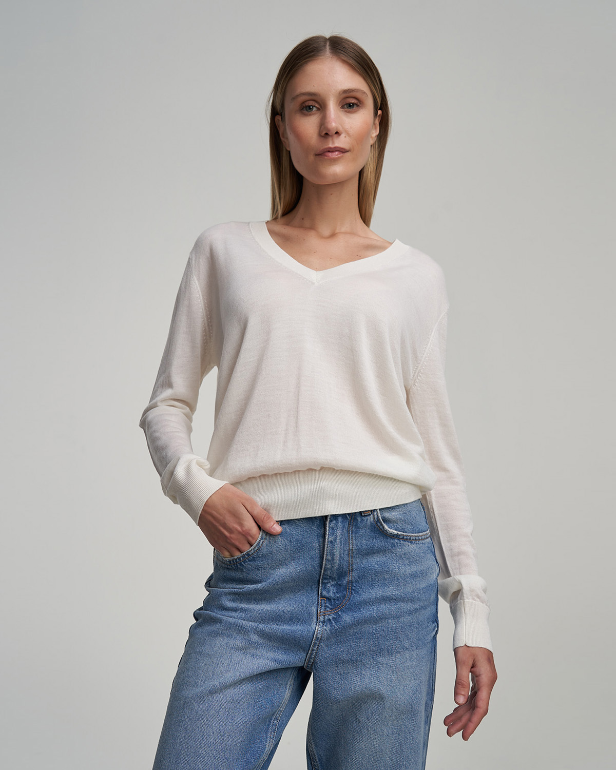 The MARGHERITA knit is a perfect blend of versatility and comfort. Made with a fine mix of merino wool and silk, this garment offers an ideal balance between softness and a subtle natural sheen. Merino wool ensures insulation and breathability, while silk adds a refined texture, giving the fabric a touch of luminosity that enhances every movement. Lightweight, breathable, and ideal for any season.