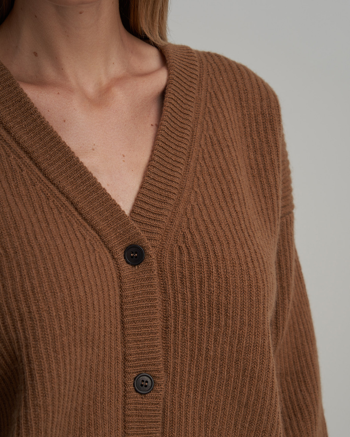 Its ribbed knit design gives the piece a sophisticated texture, enhancing the natural beauty of the wool. Perfect for adding a touch of class to any look, the GIULIA cardigan offers a comfortable fit and a versatile cut.